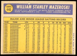1970 Topps Baseball Card (#440) of Pittsburgh Pirates Hall-of-Fame 2nd Baseman, Bill Mazeroski. Card is EX with some corner wear/dings and no creases. No writing, pin holes, tape stains. See scan for centering.