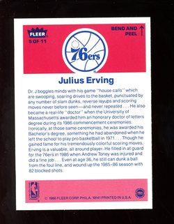 1986 - 1987 Fleer Basketball Sticker Card (#5) of Philadelphia 76'ers Hall-of-Fame Forward, Julius Erving. Card is NM with some light corner wear and no creases. No writing, pin holes, tape stains. See scan for centering.