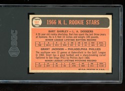 1966 Topps Baseball High Number National League Rookie Stars Card (#591) Featuring Bart Shirley Los Angeles Dodgers and Grant Jackson Philadelphia Phillies. Card is graded 6 EX-MT (Excellent to Mint) by SGC.