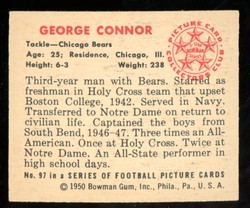 1950 Bowman Football Card (#97) of Chicago Bears Hall-of-Fame Tackle, George Connor. Card is EX-MT with some corner wear and no creases. No writing, pin holes, tape stains. See scan for centering.