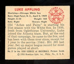 1950 Bowman Baseball Card (#37) of Chicago White Sox Hall-of-Fame Shortstop, Luke Appling. Card is EX with some corner wear and no creases. Slight rubber band bend on right edge. No writing, pin holes, tape stains. See scan for centering.