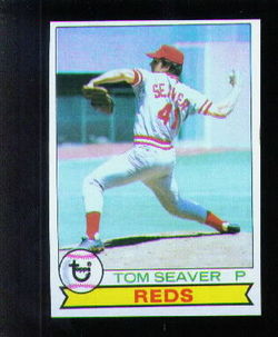 1979 Topps Baseball Card (#100) of New York Mets / Cincinnati Reds Hall-of-Fame Pitcher, Tom Seaver. Card is NM with some light corner wear and no creases. No writing, pin holes, tape stains. See scan for centering.