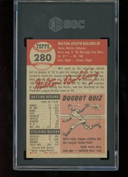 1953 Topps Baseball Short Print High Number Card (#280) of former Boston Red Sox Shortstop, Milt Bolling. Card is graded 7 NM (Near Mint) by SGC.