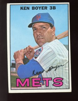 1967 Topps Baseball Card (#105) of Former New York Mets / St Louis Cardinals 3rd Baseman, Ken Boyer. Card is EX with some corner wear and no creases. No writing, pin holes, tape stains. Ding in the upper left corner. See scan for centering.