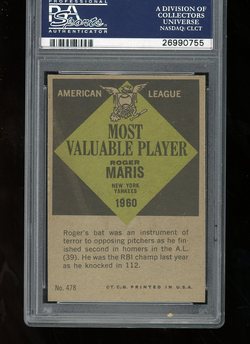 1961 Topps Baseball #478 Roger Maris MVP PSA 8 New York Yankees