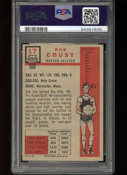1957 - 1958 Topps Basketball Rookie Card (#17) of Boston Celtics Hall-of-Fame Guard, Bob Cousy. Card is professionally graded 6 EX-MT (Excellent to Mint) by PSA.