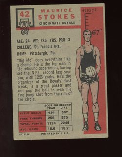 1957 - 1958 Topps Basketball Rookie Card (#42) of Cincinnati Royals Hall-of-Fame Forward, Maurice Stokes. Card is VG-EX with some corner wear and a crease in the lower right. No writing, pin holes, tape stains. See scan for centering.