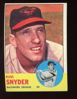 1963 Topps Baseball High Number Card (#543) of former Baltimore Orioles Outfielder, Russ Snyder. Card is EX with some corner wear and no creases. No writing, pin holes, tape stains. See scan for centering.