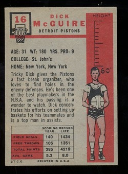 1957 - 1958 Topps Basketball Rookie Card (#16) of Detroit Pistons Hall-of-Fame Guard, Dick McGuire. Card is EX-MT with some corner wear and no creases. No writing, pin holes, tape stains. Small ding in the lower right corner. See scan for centering.