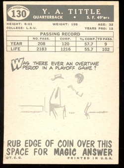 1959 Topps Football Card (#130) of San Francisco 49'ers Hall-of-Fame Quarterback, YA Tittle. Card is EX-MT with some light corner wear and no creases. No writing, pin holes, tape stains. See scan for centering.