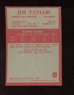 1965 Philadelphia Gum Co. Football Card (#82) of Green Bay Packers Hall-of-Fame Running Back, Jim Taylor.