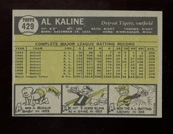1961 Topps Baseball Card (#429) of Detroit Tigers Hall-of-Fame Outfielder, Al Kaline. Card is EX-MT+ with some light corner wear and no creases. No writing, pin holes, tape stains. See scan for centering.
