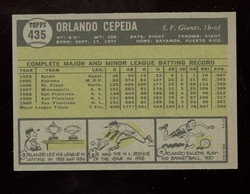 1961 Topps Baseball Card (#435) of San Francisco Giants Hall-of-Fame Outfielder, Orlando Cepeda. Card is NM with some light corner wear and no creases. No writing, pin holes, tape stains. See scan for centering.