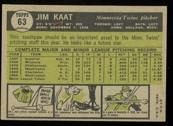 1961 Topps Baseball Card (#63) of Former Minnesota Twins Star Pitcher, Jim Kaat. Card is EX+ with some corner wear and no creases. No writing, pin holes, tape stains. See scan for centering.