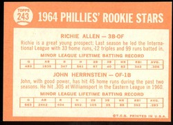 1964 Topps Baseball Philadelphia Phillies Rookie Stars Card (#243) Featuring Richie Allen and John Herrnstein. Card is EX-MT with some corner wear and no creases. No writing, pin holes, tape stains.See scan for centering.