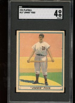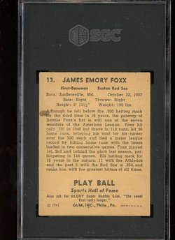 1941 Play Ball Baseball Card (#13) of Boston Red Sox Hall-of-Fame 1st Baseman, Jimmie Foxx. Card is professionally graded 4 VG-EX (Very Good to Excellent) by SGC.