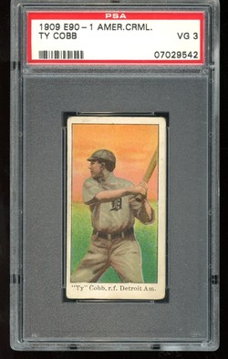 1909 E90-1 American Caramel Company Baseball Card of Detroit Tigers Hall-of-Fame Outfielder, Ty Cobb. Card is professionally graded 3 VG (Very Good) by PSA.