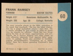 1961 Fleer Basketball In Action Card (#60 - Is ON Guard) of Boston Celtics Hall-of-Fame Forward, Frank Ramsey. Card is VG-EX with corner wear and a back crease in the lower left. . No writing, pin holes, tape stains. See scan for centering.