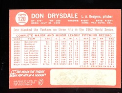 1964 Topps Baseball Card (#120) of Los Angeles Dodgers Hall-of-Fame Pitcher, Don Drysdale. Card is EX with some corner wear and no creases. No writing, pin holes, tape stains. See scan for centering.