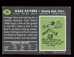 1969 Topps Football Card (#51) of Chicago Bears Hall-of-Fame Running Bears, Gale Sayers. Card is EX with some corner wear/dings and no creases. No writing, pin holes, tape stains. See scan for centering.