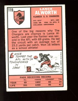 1966 Topps Football Card (#119) of San Diego Chargers Hall-of-Fame Wide Receiver, Lance Alworth.