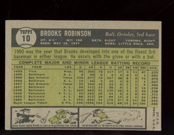 1961 Topps Baseball Card (#10) of Baltimore Orioles Hall-of-Fame 3rd Baseman, Brooks Robinson. Card is EX+ with some corner wear and a small crease along the top edge. No writing, pin holes, tape stains. See scan for centering.