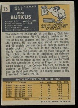 1971 Topps Football Card (#25) of Chicago Bears Hall-of-Fame Linebacker, Dick Butkus. Card is EX with some corner wear and no creases. No writing, pin holes, tape stains. See scan for centering.