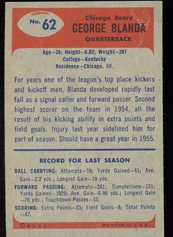 1955 Bowman Football Card (#62) Of Chicago Bear Hall-of-Fame Quarterback, George Blanda.