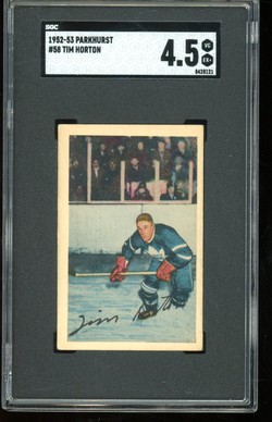 1952 - 1953 Parkhurst Hockey Rookie Card (#58) of Toronto Maple Leafs Hall-of-Fame Defenseman, Tim Horton. Card is graded 4.5 VG-EX+ (Very Good to Excellent Plus) by SGC.