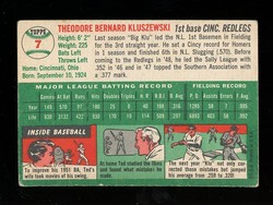 1954 Topps Baseball Card (#7) of Former Cincinnati Reds Star 1st Baseman, Ted Kluszewski. Card is EX with some corner wear and no creases. No writing, pin holes, tape stains. Ding in the lower left corner. Some light surface wear. See scan for centering.