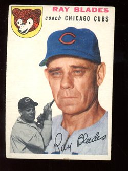 1954 Topps Baseball Card (#243) of former Chicago Cubs Coach, Ray Blades. Card is EX- with some corner wear/dings and no creases. No writing, pin holes, tape stains. See scan for centering