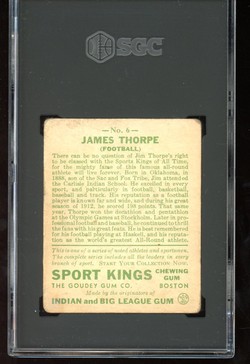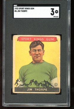 1933 Goudey Sports Kings Football Rookie Card (#6) Of Canton Bulldogs Hall-of-Fame Running Back, Jim Thorpe. Card is graded 3 VG (Very Good) by SGC.