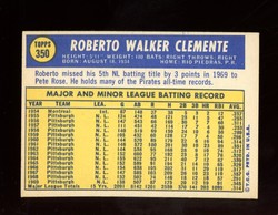 1970 Topps Baseball Card (#350) of Pittsburgh Pirates Hall-of-Fame Outfielder, Roberto Clemente. Card is EX-MT with some corner wear and no creases. No writing, pin holes, tape stains. See scan for centering.