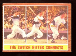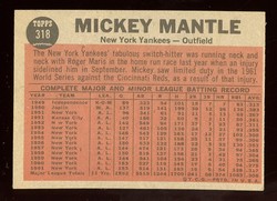 1962 Topps Baseball In Action Switch Hitter Connects Card (#318) of New York Yankees Hall-of-Fame Outfielder, Mickey Mantle.