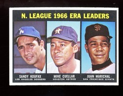 1967 Topps Baseball Card National League ERA Leaders Card (#234) Featuring Mike Cuellar and Hall-of-Famers Juan Marichal and Sandy Koufax. Card is EX-MT with some corner wear and no creases. No writing, pin holes, tape stains. Small ding in the upper left corner. See scan for centering.