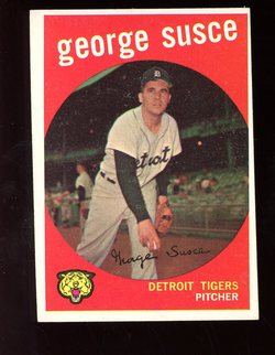 1959 Topps Baseball High Number Card (#511) of Former Detroit Tigers Pitcher, George Susce. Card is EX-MT+ with some light corner wear and no creases. No writing, pin holes, tape stains. See scan for centering.