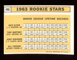 1963 Topps Baseball High Number Short Print Rookie Stars Card (#466) Featuring Tony Martinez, Nate Oliver, Jerry Robinson and Bill Freehan.