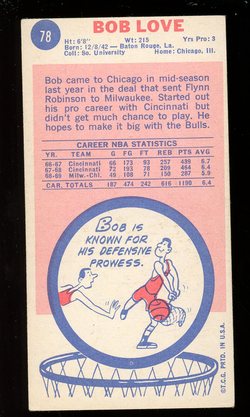 1969-70 Topps Basketball Rookie Card (#78) Of former Chicago Bulls Star Forward, Bob Love.