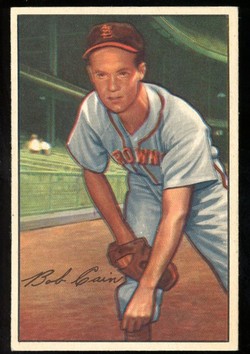 1952 Bowman Baseball Card (#19) of St Louis Browns Pitcher, Bob Cain. Card is EX with some corner wear and a back crease in the upper left corner. See scan for centering.