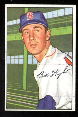 1952 Bowman Baseball Card (#117) of Boston Red Sox Pitcher, Bill Wight. Card is EX-MT+ with some light corner wear and no creases. No writing, pin holes, tape stains. Faint print line. See scan for centering.