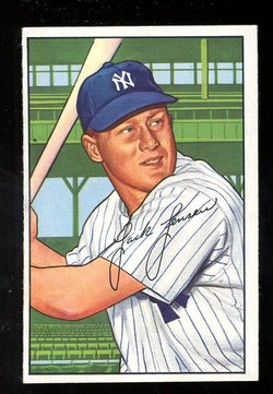 1952 Bowman Baseball Card (#161) of New York Yankees Star Outfielder, Jackie Jensen. Card is EX-MT with some light corner wear and no creases. No writing, pin holes, tape stains. Small wax stain on back. See scan for centering.