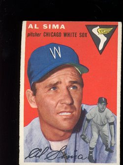 1954 Topps Baseball Card (#216) of former Chicago White Sox Pitcher, Al Sima. Card is EX with some corner wear/dings and no creases. No writing, pin holes, tape stains. See scan for centering