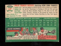 1954 Topps Baseball Card (#17) of New YOrk Yankees Hall-of-Fame Infielder, Phil Rizzuto. Card is EX+ with some corner wear and no CReases. No writing, pin holes, tape stains. Ding in the lower right corner. See scan for centering.