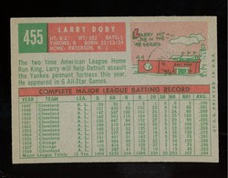 1959 Topps Baseball Card (#455) Of Detroit Tigers / Cleveland Indians Hall-of-Fame Outfielder, Larry Doby. Card is EX-MT+ with some light corner wear and no creases. No writing, pin holes, tape stains. See scan for centering.