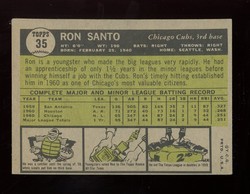 1961 Topps Baseball Rookie Card (#35) of Chicago Cubs Hall-of-Fame 3rd Baseman, Ron Santo. Card is EX with some corner wear and a light crease along the right edge. See scan for centering.