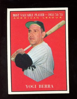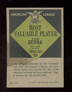 1961 Topps Baseball MVP Card (#472) of New York Yankees Hall-of-Fame Cacther, Yogi Berra. Card is EX with some light corner wear and no creases. No writing, pin holes, tape stains. Heavy wax stain on back. See scan for centering.