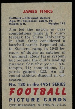 1951 Bowman Football Card (#130) Of Hall-of-Fame Football Executive and Former Pittsburgh Steelers Quarterback, James Jim Finks.