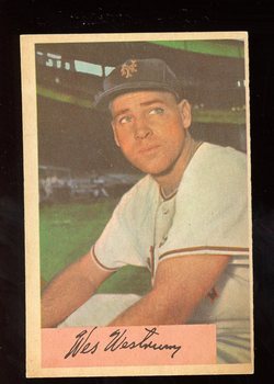 1954 Bowman Baseball Card (#25 - Fielding Average.982/986) of former New York Giants Catcher, Wes Westrum. Card is EX+ with some light corner wear and a light surface crease along the right edge. No writing, pin holes, tape stains. See scan for centering.