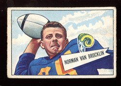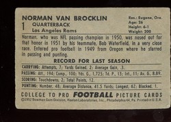 1952 Bowman Large Football Short Print Card (#1) of Los Angeles Rams Hall-of-Fame Quarterback, Norm Van Brocklin. Card is Good with some corner wear/dings and surface creases. See scan for centering.