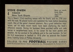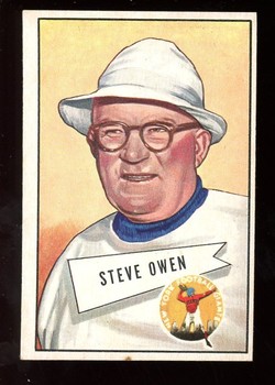 1952 Bowman Large Football Rookie Card (#4) of New York Giants Hall-of-Fame Coach, Steve Owen. Card is EX-MT+ with some light corner wear and no creases. See scan for centering.